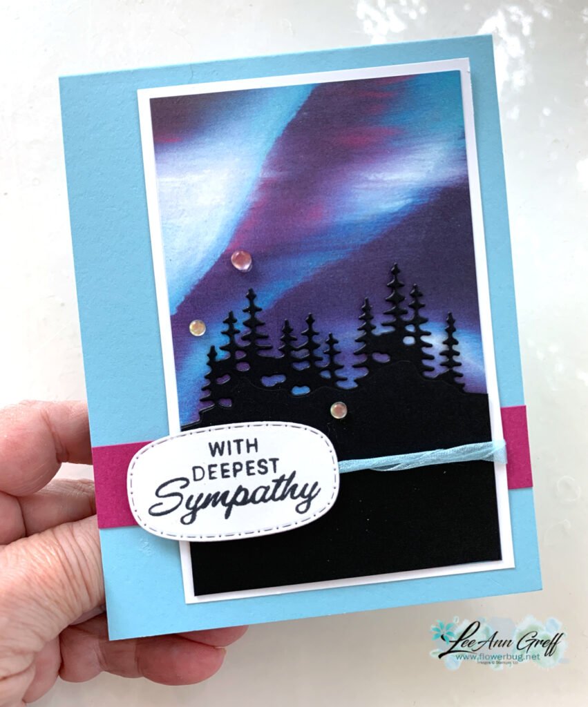It features the Lights of Aurora suite seen here. I made sure to cute my designer paper at 3″ wide so I could get 2 pieces from each 6″ piece. We made this pretty card at my September card clubs.