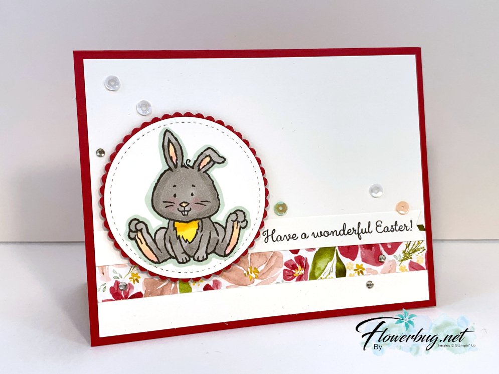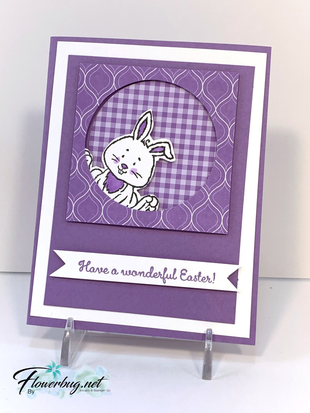 I love this peek-a-boo bunny here!  Yes; it's fussy cut.  There aren't dies for it.  She used Highland Heather and our Subtles designer paper.  I really like how she die-cut a circle from the square, flipped it over to reveal the reverse side of the designer paper. Very cool!  See all of our packages of 6 X 6" designer paper here.