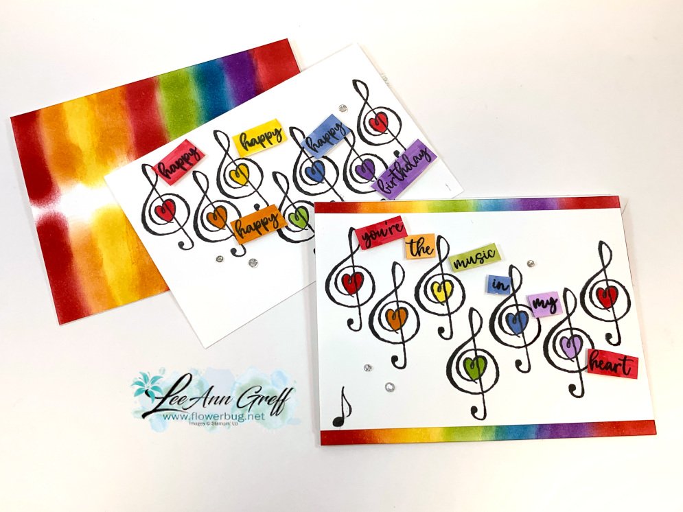 We stamped the treble clef multiple times and the greeting on a separate piece of White CS.  Then we fussy cut the words apart and colored each one with a Blends marker.