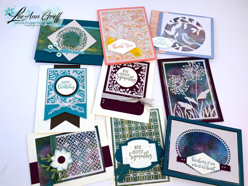 I used the Perennial Essence designer paper with the gorgeous laser-cut paper. You get 6 sheets of this specialty paper in the pack.  I used just one sheet on these 9 cards and had some left!