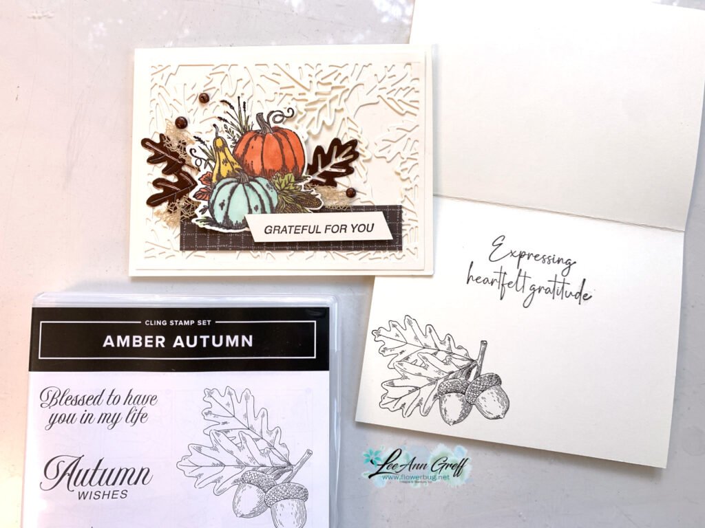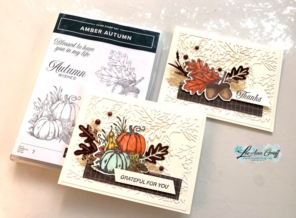 It features the Amber Autumn bundle seen here. That beautiful, detailed background die creates the gorgeous backdrop for the pretty colored images and you can also get multiple leaf die-cuts from it by clipping them apart.