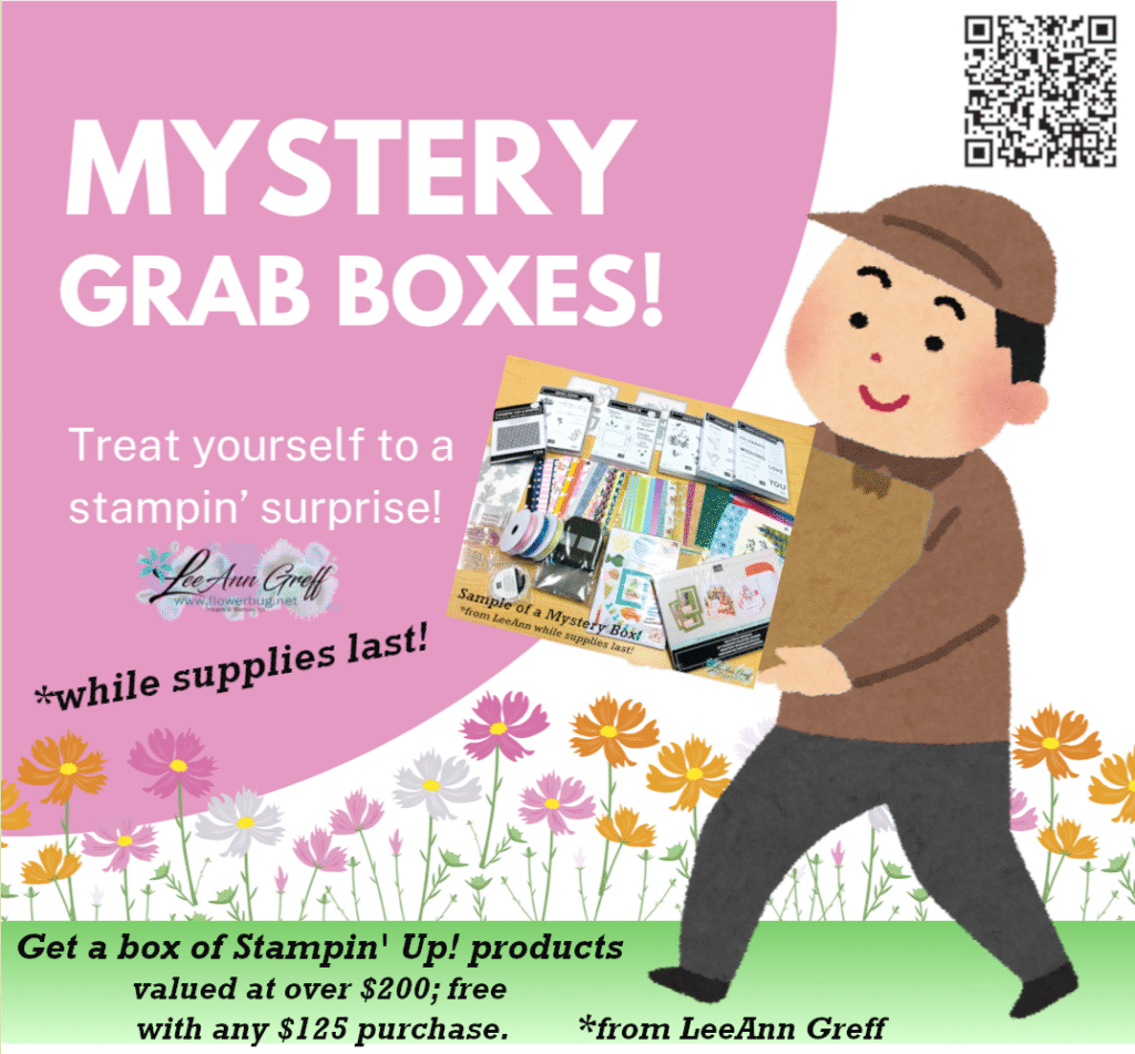Each year in the fall I de-stash my supplies by offering mystery boxes to my customers. Each box is filled with over $200 in retired Stampin’ Up! products and each box is different!