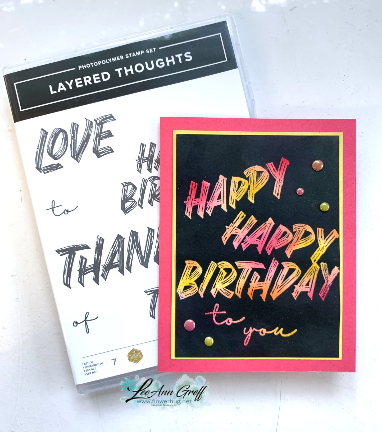 I shared how to do it on last week’s Live video. The card I’m featuring today uses the Layering Thoughts technique with three of our newest In Colors – Strawberry Slush, Darling Duckling and Timid Tiger.