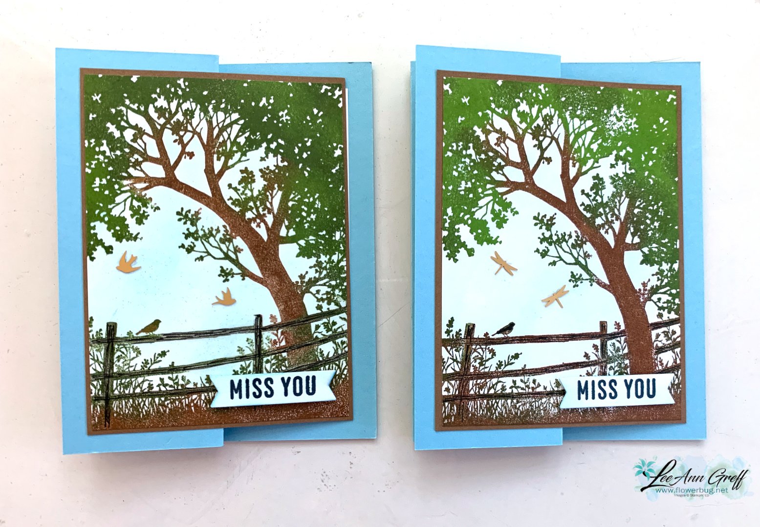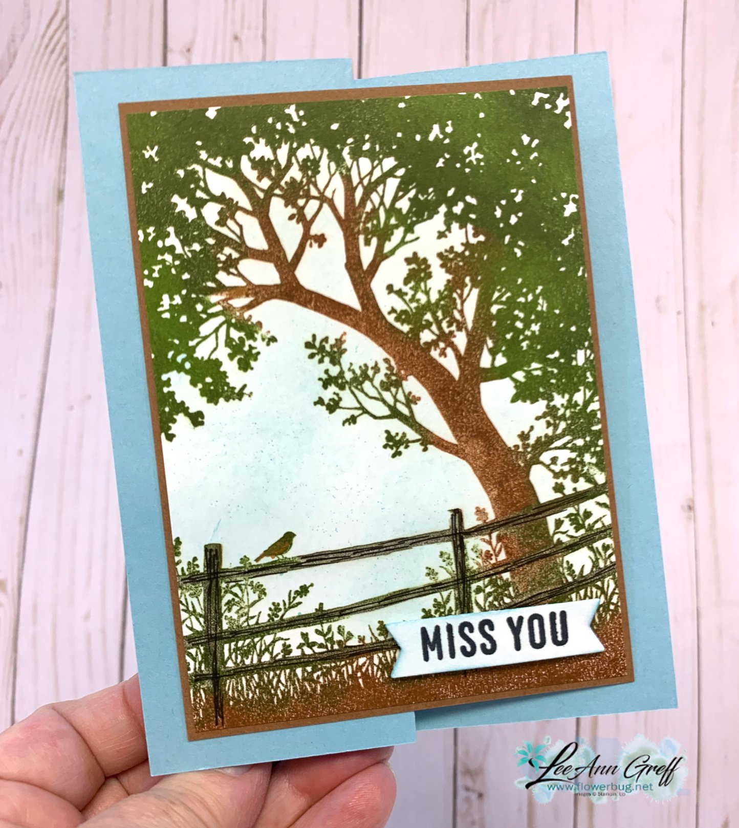 How did I color the image?  I inked the trees with Old Olive ink first using the direct to stamp method. The I used Pecan Pie on the grass and fence.  I used a sponge dauber to remove ink from the plants on the bottom so I could add Green ink to them with a sponge dauber.  I used Pecan Pie ink and a sponge dauber to add color to the trunk as well.  I hope you'll watch the video below to watch this in action.