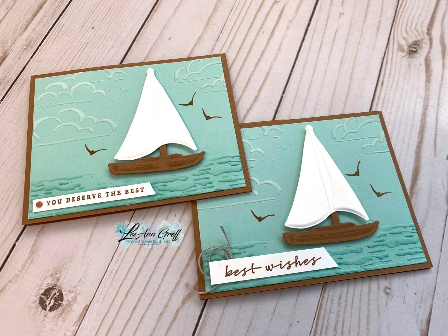 My colors include Pool Party, White and Pecan Pie. The Hybrid embossing folder in this bundle allows you to get a textured sailboat – you can cut & texture all at once!  Watch the video to see how it's done.