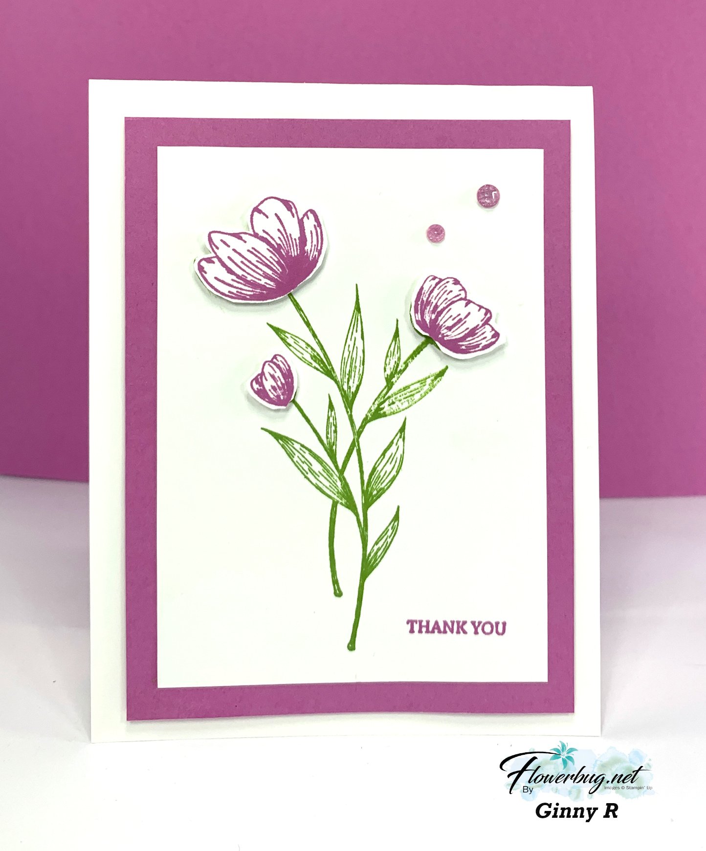 She used Petunia Pop with Granny Apple green and popped up her flowers on Dimensionals.  Well done!