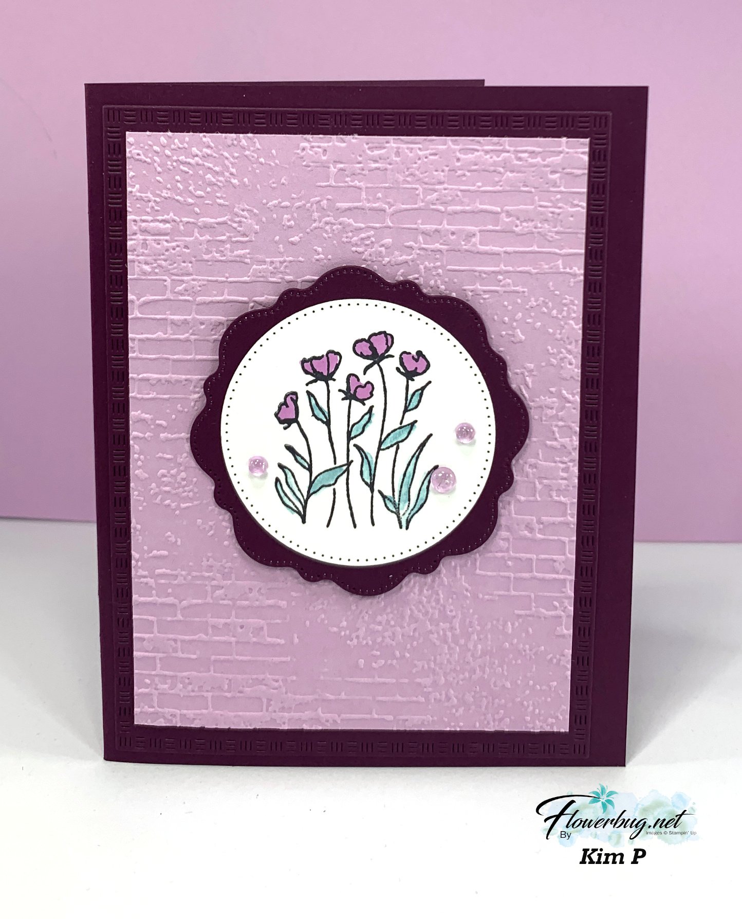 She used the Thoughtful Wishes stamp set and the Exposed Brick 3D embossing folder here.  Her colors include Fresh Freesia and Blackberry Bliss. Sweet & simple!  Good job Kim!