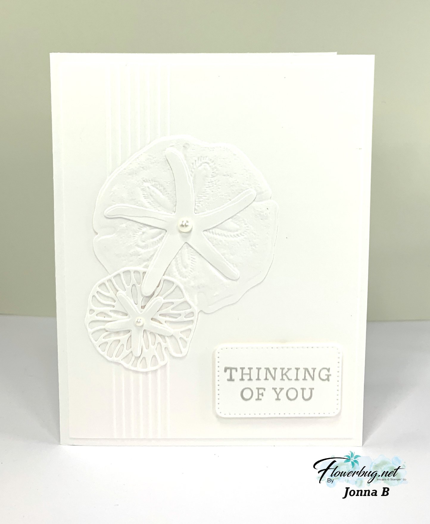 She used the Mini corrugated 3D embossing folder seen here and linen thread.  Plus the Painted Lavender & Friends for Life die-cuts on her Basic Beige & White card.