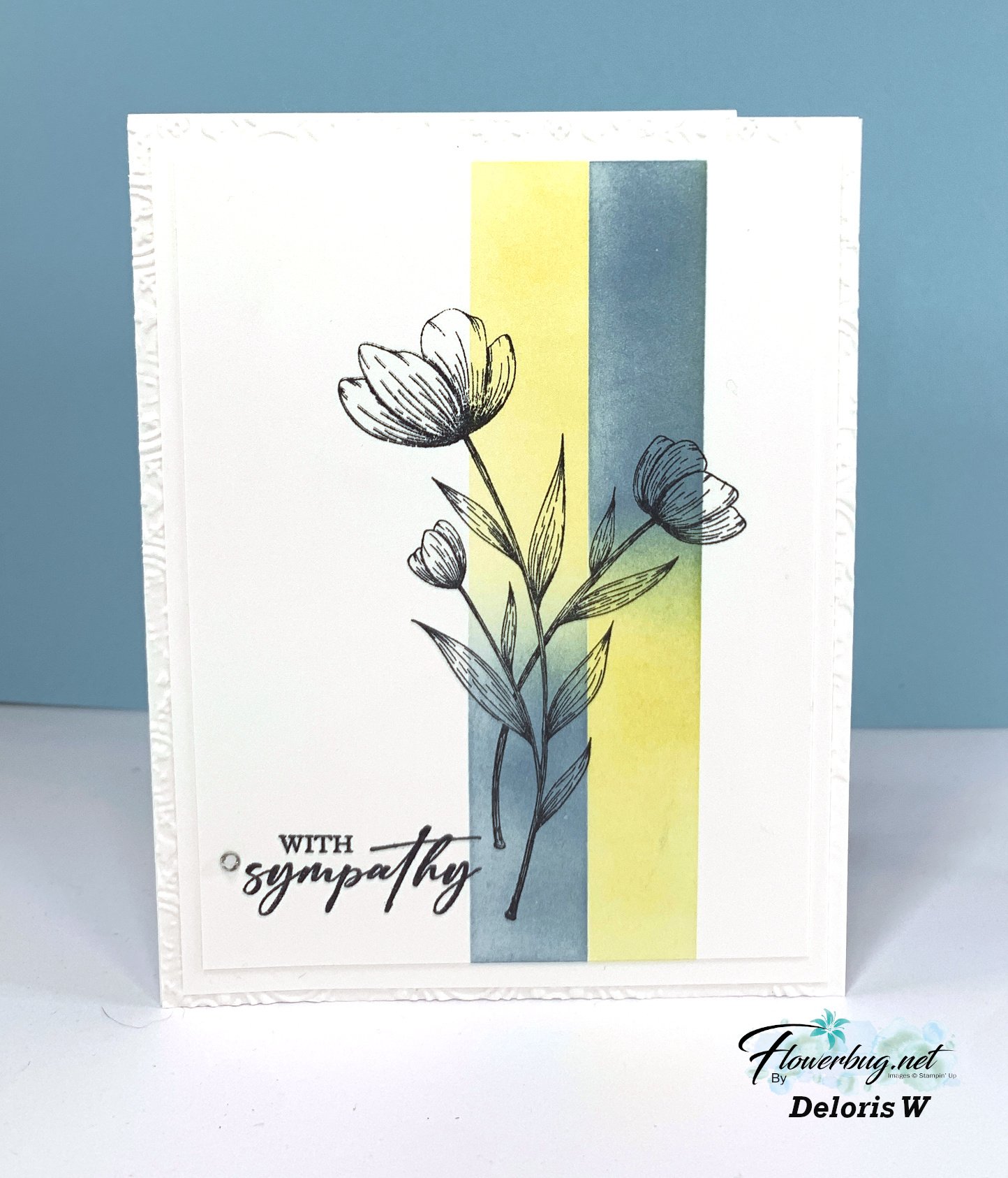 She masked her White card stock to sponge yellow & blue ink to create a pretty background for the floral stamp.  This flower is from the Spotlight on Nature stamp set.  Her card also has 3 layers of White – the bottom layer is textured.  Gorgeous!