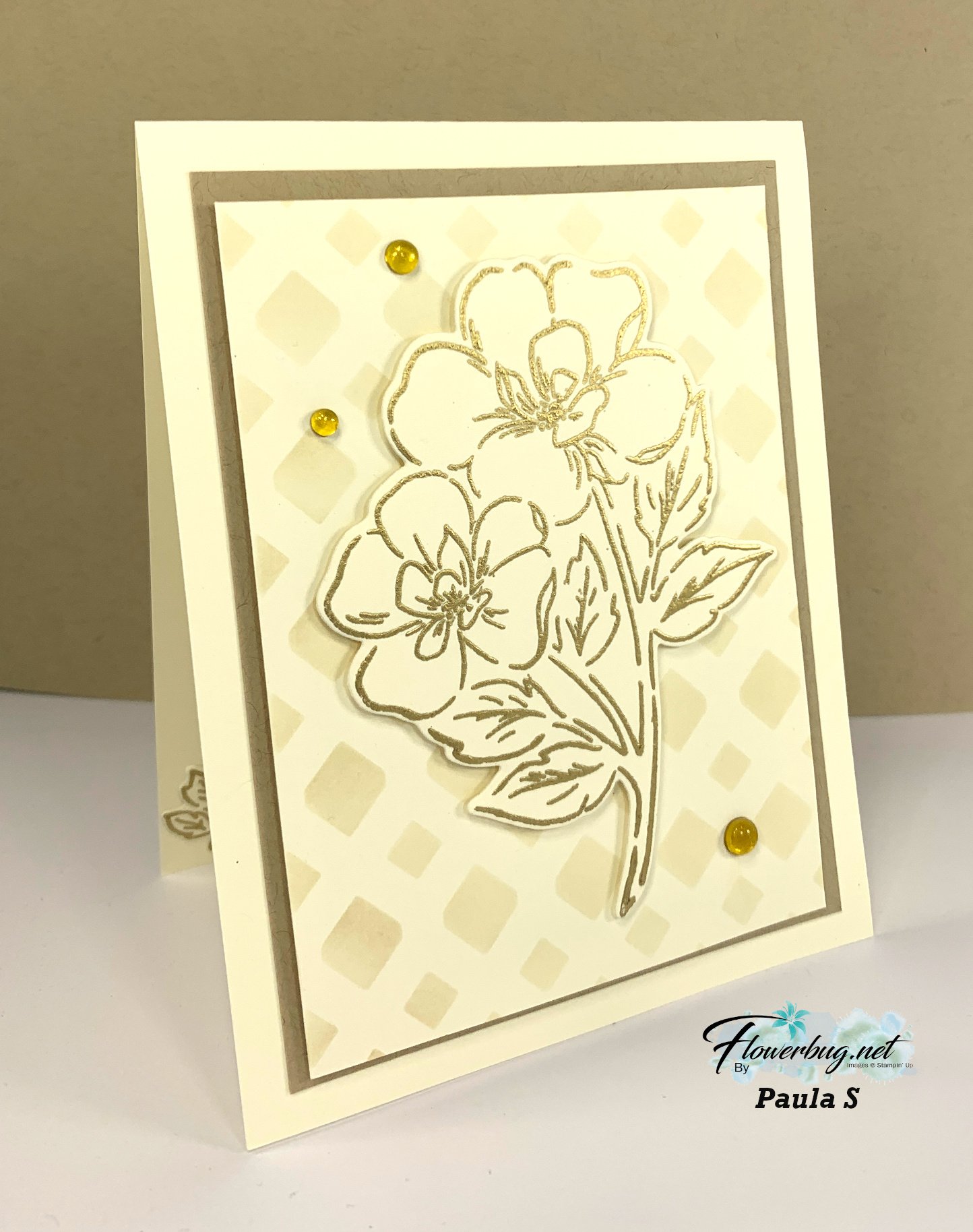 Her colors include Very Vanilla & Crumb Cake. She heat embossed the floral image in Gold embossing powder. The background is made with the Thankful Garden stencils included in the bundle.