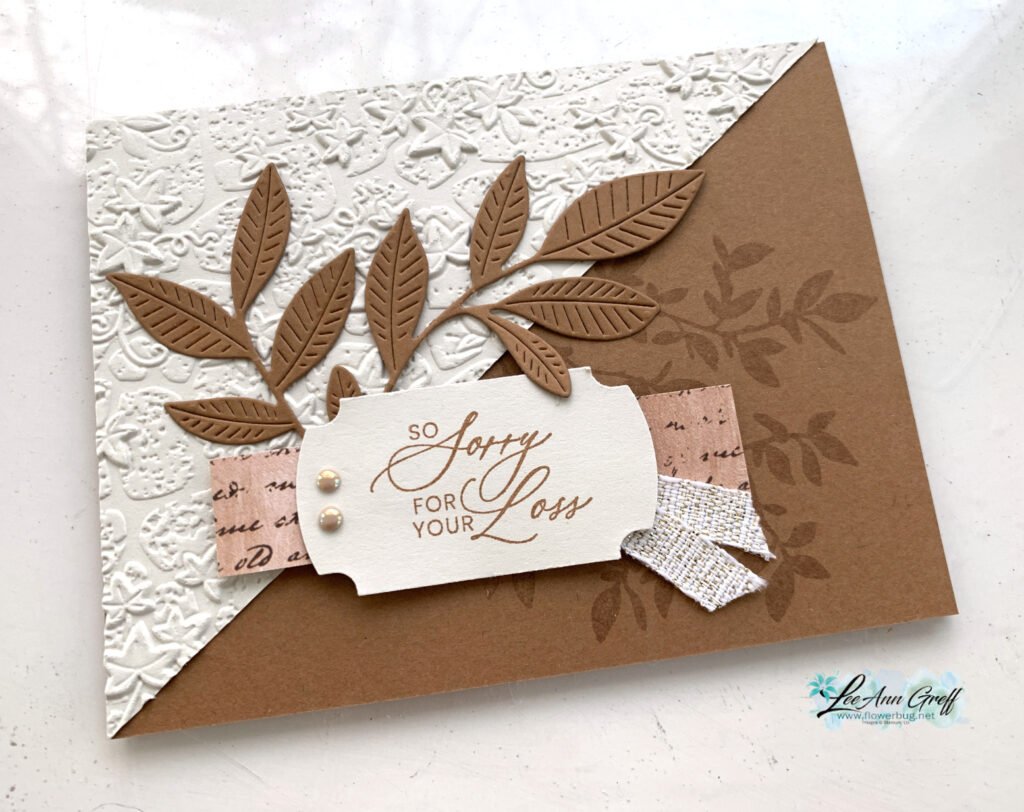 The stamp & dies bundle is called Nature’s Symphony. The textured triangle is the new Stone & Vine 3D embossing folder. The greeting is from the new Prayer’s & Promises stamp set – it’s a wonderful new set for sympathy or thinking of you greetings. The greeting is the Labeled with Love punch seen here.
