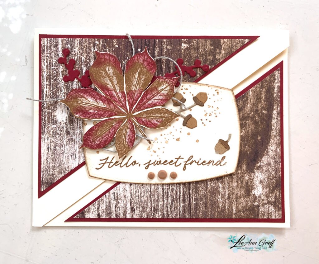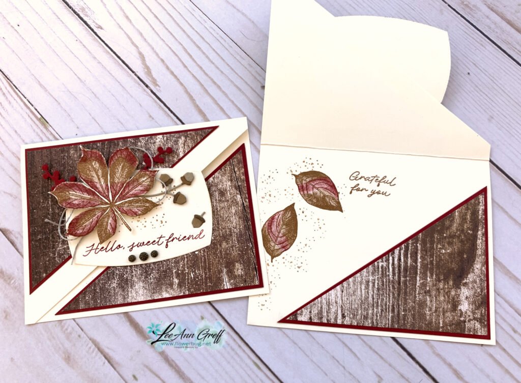 I did fussy cut the large leaf for the card front. In the video I share how to get the diagonal cut even on the front card base in the video. It’s so easy!