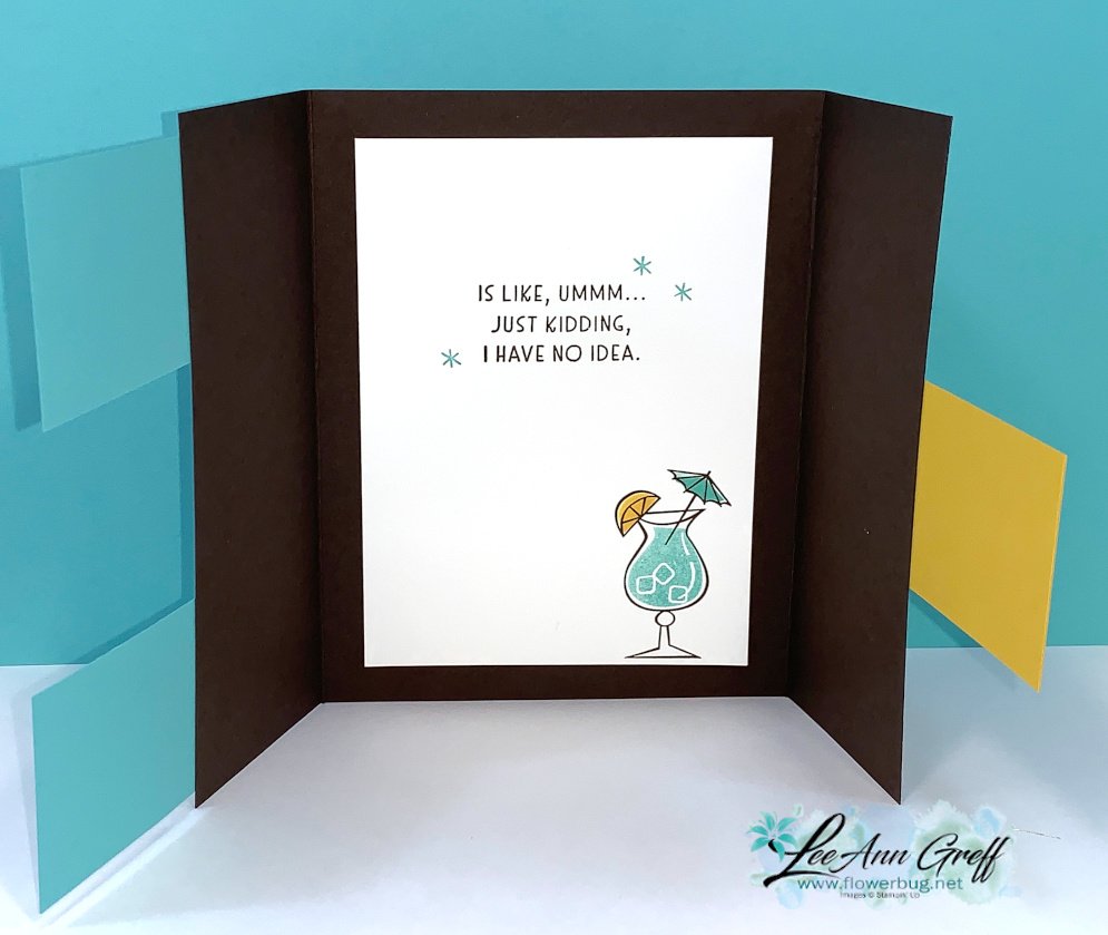 It's a triple flap gate-fold card!  It's super easy to make and fun to open too.  Check out the measurements AND the video below. Be sure to read the front AND the inside below. This stamp set is just plain FUN!