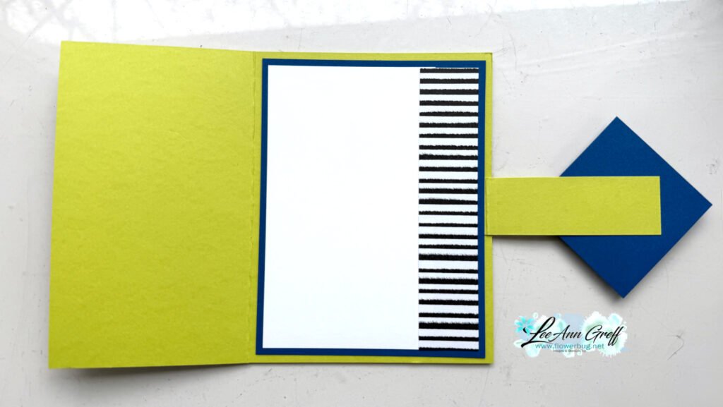 My colors include Lemon Lime Twist, Blueberry Bushel with White. The scored side flap flips to the right and has the diagonal squares with the greetings attached. The greeting is part of the Greetings for All Ephemera pack again; added to the Labeled with Love punched piece. This is retiring now and available here while supplies last.