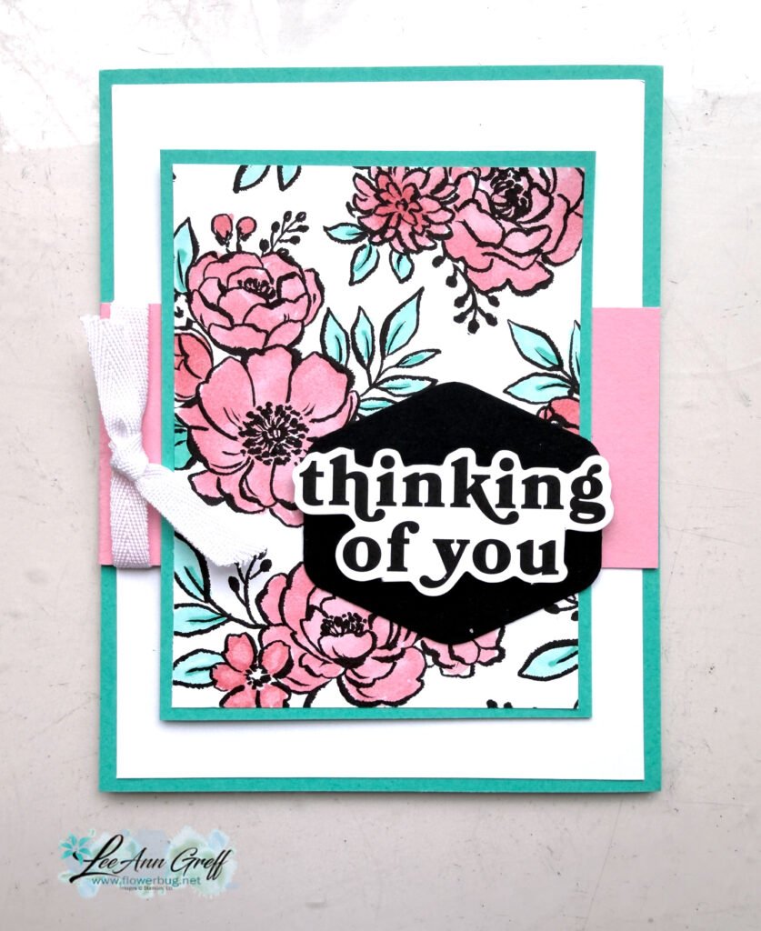 I chose to use two of the retiring 2024-26 In Colors for this one. Summer Splash and Pretty in Pink with Black & White. This Artisan Sketched Garden DSP is all Black & White but I colored the flowers and leaves in with Blends markers. The greeting image is from the Greetings for all Ephemera pack seen here. It’s one of my very favorite greeting packs and it’s carrying over too! The Black punched piece is from the Heartfelt Hexagon punch. Sadly it just retired and is not out of stock.