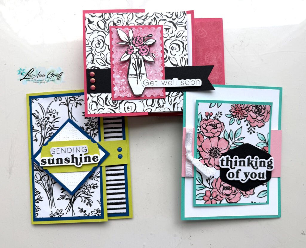 Yesterday I shared one of these fun fold cards and today I’ll share the other two. All feature the brand new Artisan Sketched Garden designer paper. It’s coming out on May 5th in the May-August catalog from Stampin’ Up!