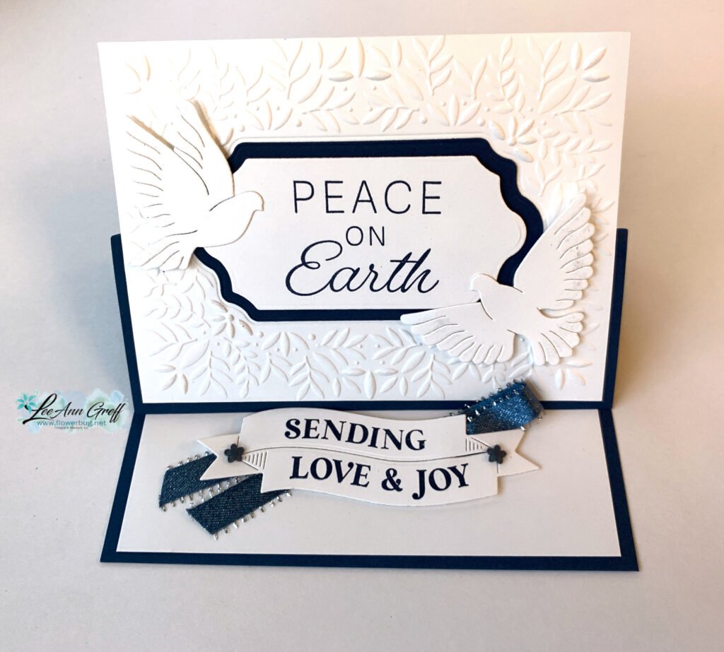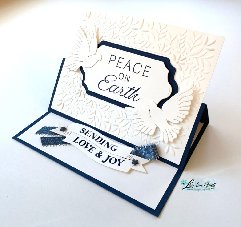 My colors are Night of Navy with White. The beautiful Peace on Earth bundle and Peaceful Greenery embossing folder are the stars here. I also added Wink of Stella to the dove’s wings.