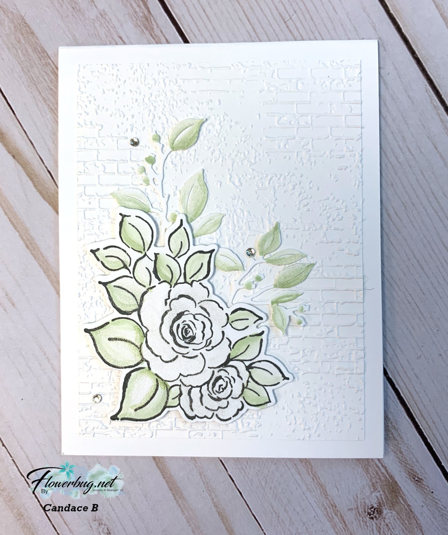The pretty leaf die-cuts also have Soft Seafoam Blends added. The texture is the Exposed Brick embossing folder seen here.   I just love the clean look of this pastel color with White.