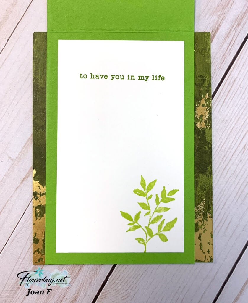 Here’s the inside view.  Simply stamping the flower image in the same ink is a beautiful say to finish it.