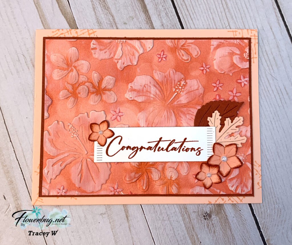 Her colors include Petal Pink, Calpyso Coral and Cajun Craze. She used the Happy Hibiscus bundle. It was on the Last Chance list; but only the embossing folder & dies are left but they are discounted and they easily stand alone without the stamp set!  See them here.