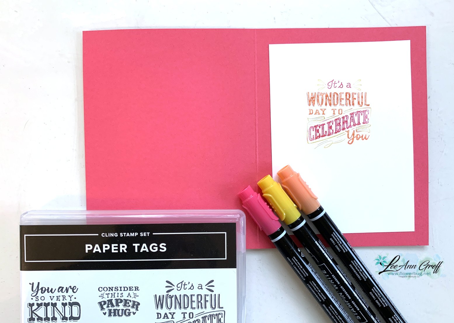 I shared how to do it on last week’s Live video. The card I’m featuring today uses the Layering Thoughts technique with three of our newest In Colors – Strawberry Slush, Darling Duckling and Timid Tiger.