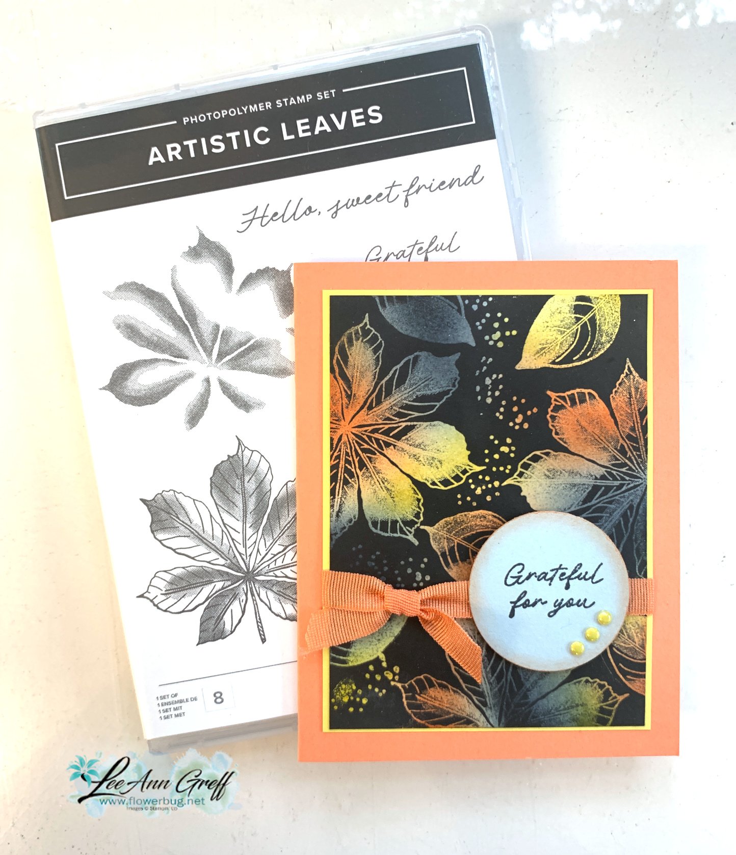My colors include Secret Sea, Timid Tiger and Darling Duckling.  The stamp set is called Artistic Leaves and can be seen here.