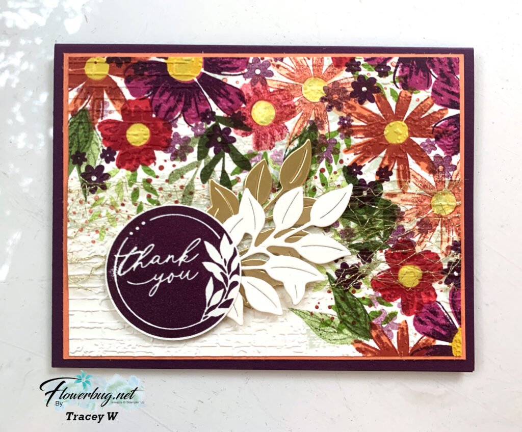 Isn’t it stunning?! Tracey loves to create her own background with stamps. It looks like printed paper! She says she stamped the flowers & leaves in 12 different ink colors!! Wow!