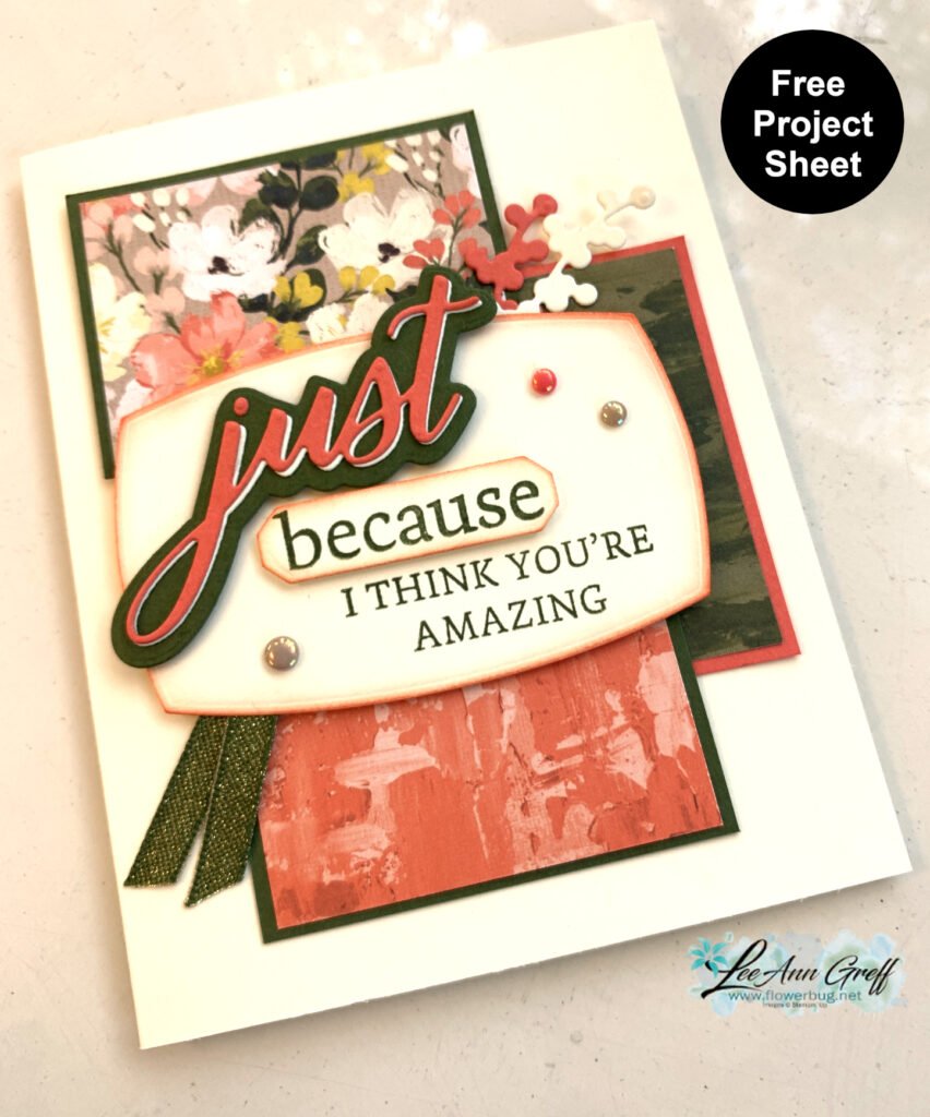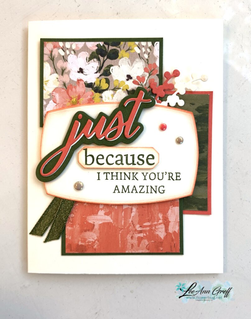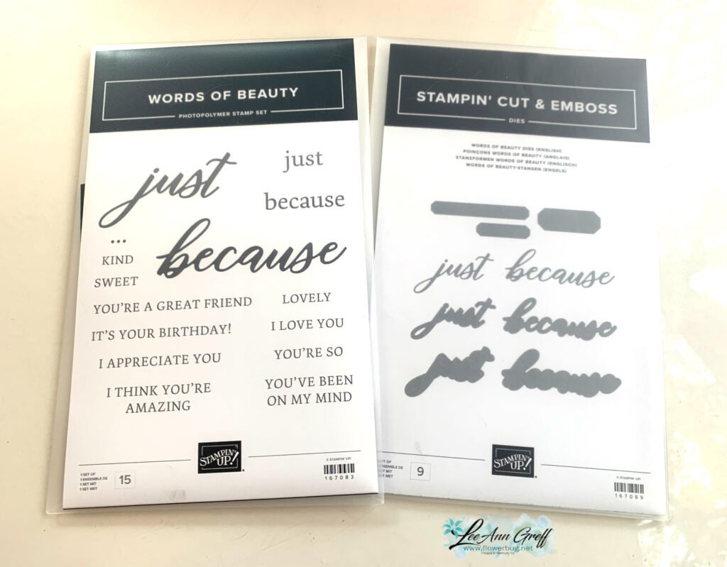 The Words of Beauty bundle will be a great option for greeting phrases. It includes two large sets of dies with the words ‘just’ and ‘because’ and then plenty of words to create your greeting. Plus the die I used with the word ‘because’ below is one of three in the package.