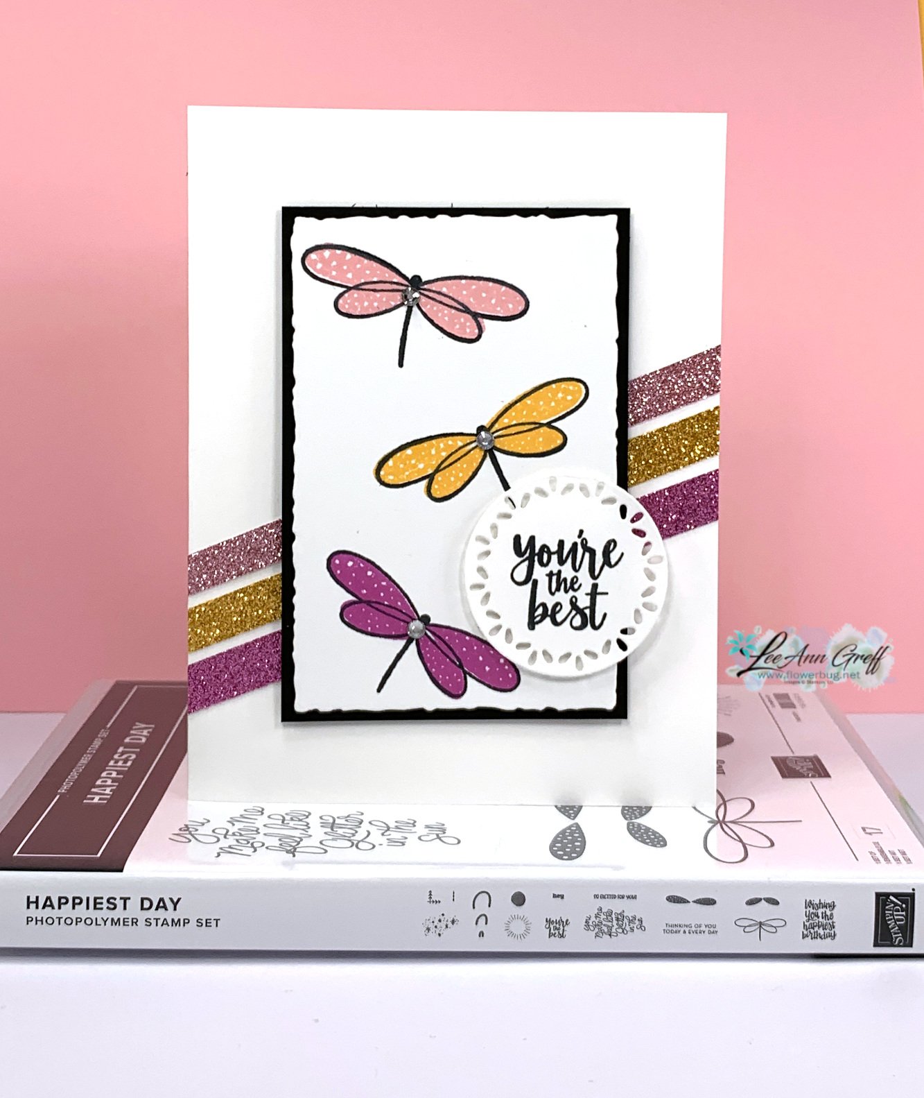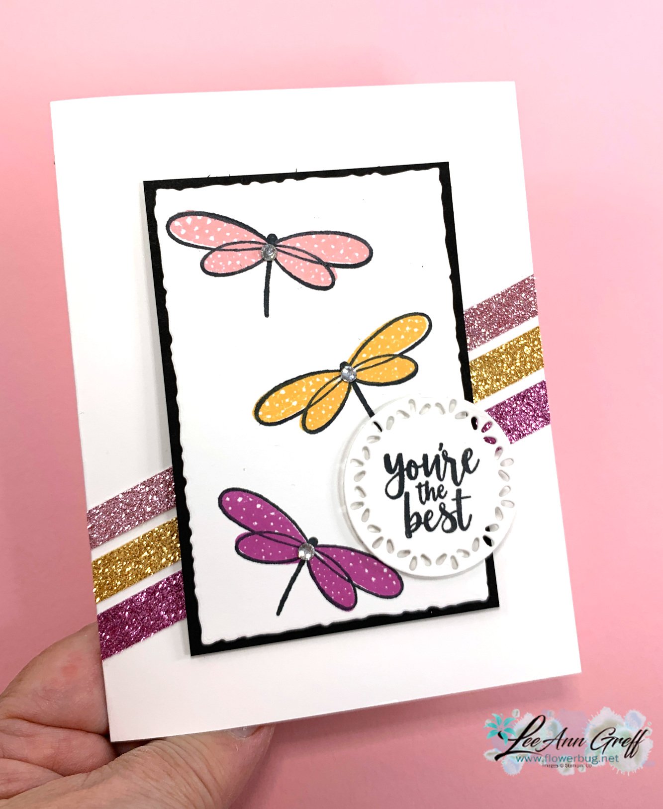 I chose to use our 2023-25 In Colors; Pretty in Pink, Peach Pie and Petunia Pop along with Black. We have glimmer paper in these colors too so I added three strips to the card base at a diagonal.  See it here.  The strips adds a bit of a whimsical look that matches these cute dragonflies.