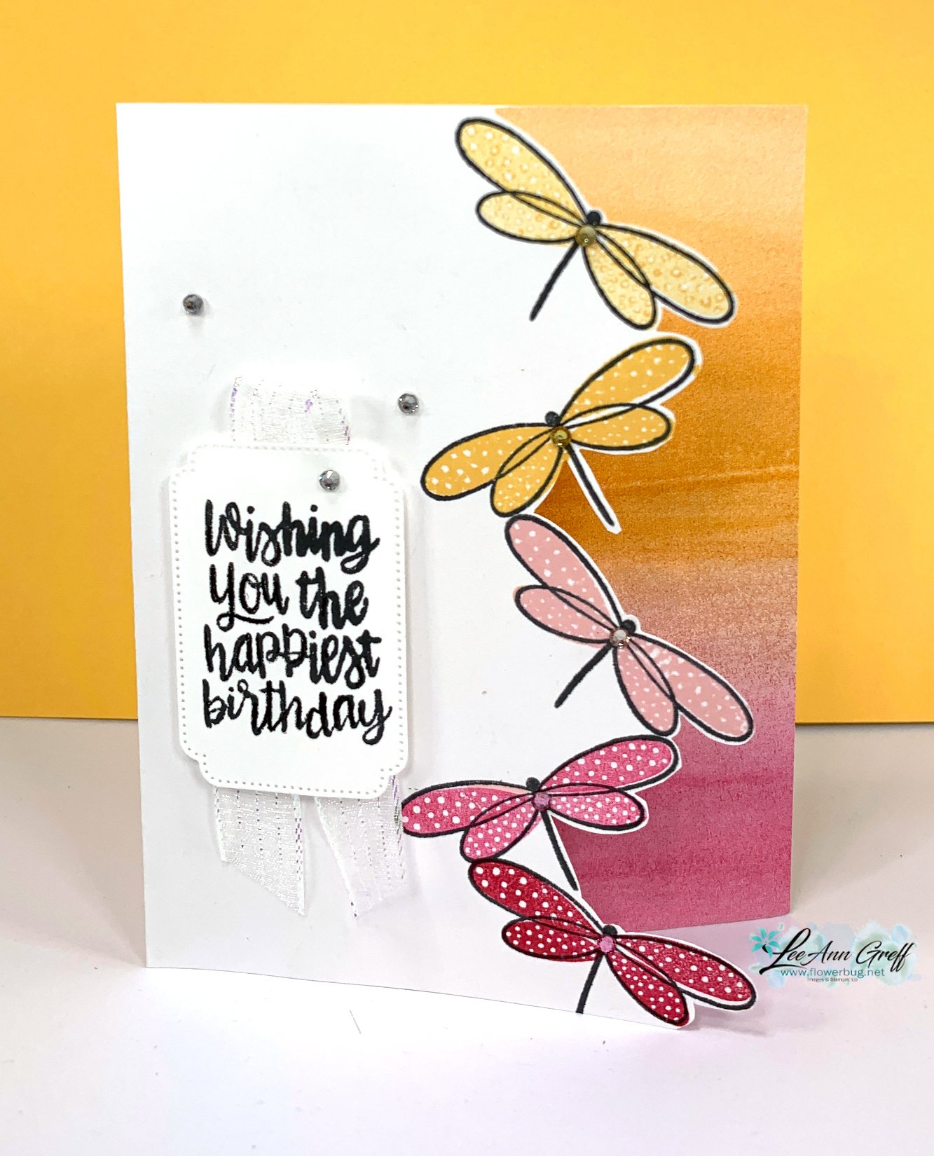 The Happiest Day stamp set is adorable; I love the whimsical dragonflies and the bold greetings. Having two separate images for the wings means you can change up the colors for 2-toned results.  See the set here.