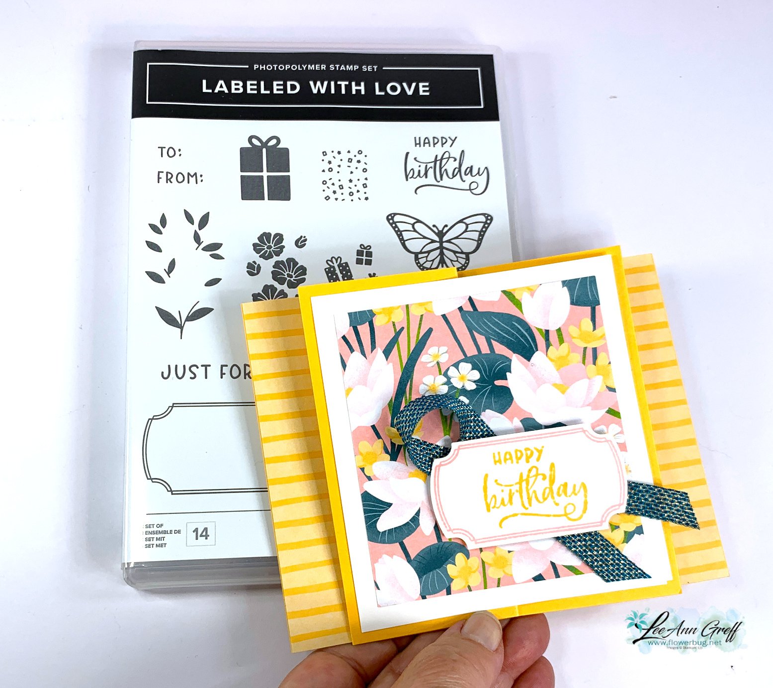 This neat fun fold card features the Lily Pond Lane designer series paper and the Labeled with Love punch bundle seen here.