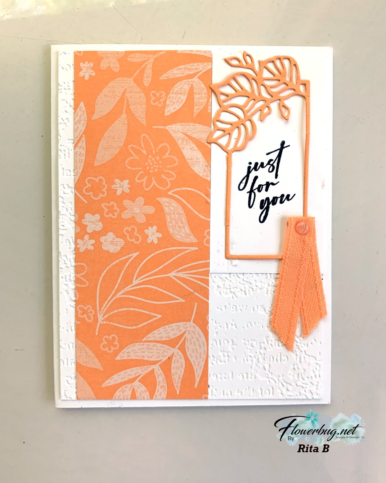 Her colors include Peach Pie, Black and White. The DSP is the 2024-26 In Color 6 X 6" pack. She added embossed texture to the background.  I especially like how she added that pretty leaf die-cut frame over her stamped greeting.  A fabulous idea where you don't have to cut the greeting layer to match the die-cut exactly.