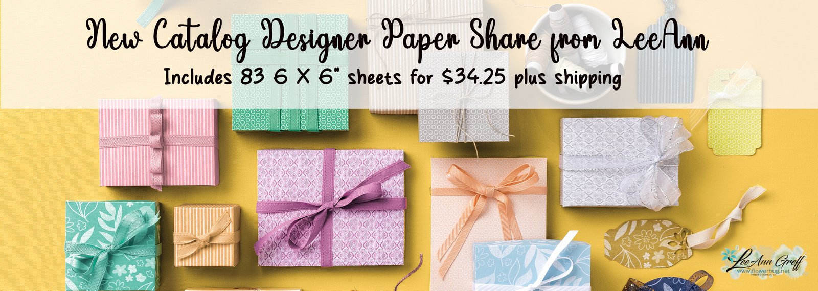 This share costs $40 with shipping ($34 without) and includes 83 sheets (6 X 6") of all new designer papers including the following: