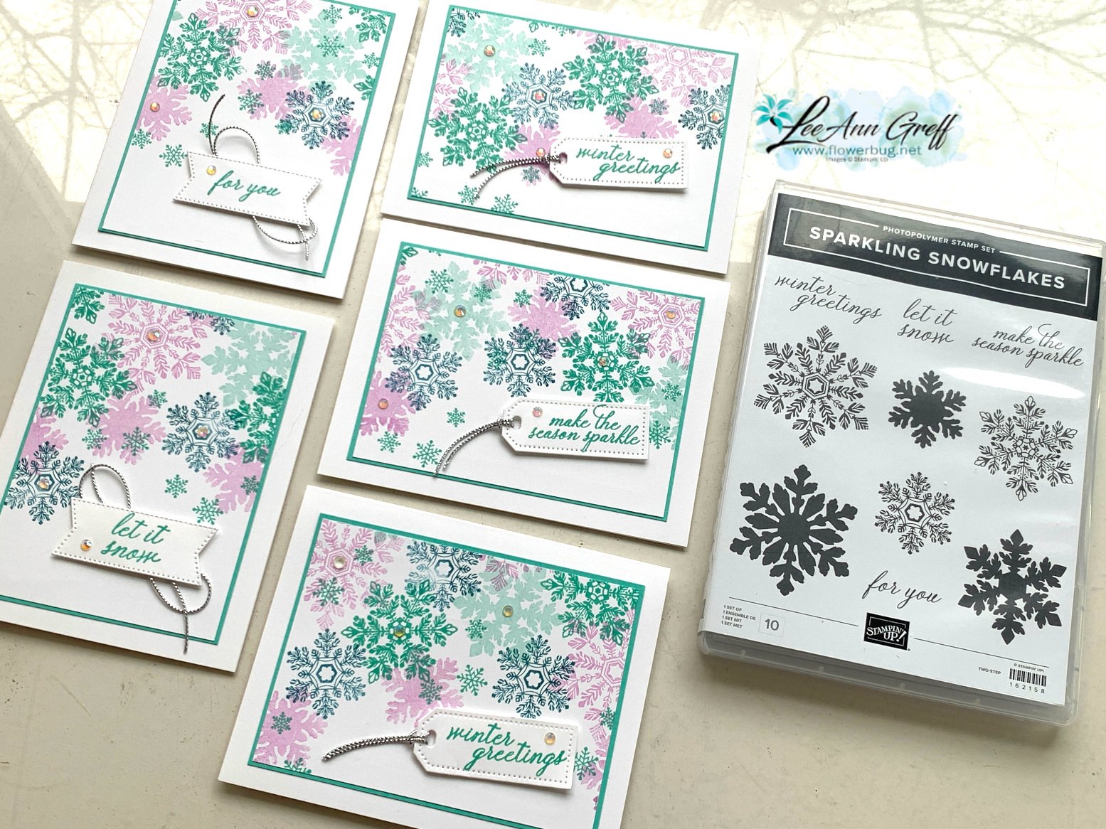 I used the Sparkling Snowflakes stamp set seen here. Snowflakes can be wintery or holiday; they're quite versatile.  I added greetings using the Tailor Made Tags & Stylish Shapes dies with a bit of Elegant trim cording.