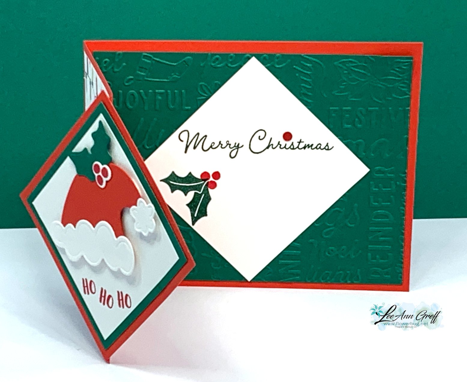 This fun fold might look difficult but if you watch the video here you'll find it's quite easy.  It involves a bit of scoring and trimming. The diagonal square layer is separate from the card base.  The designer paper is the Merry, Bold & Bright seen here.  I'm featuring it in one of my pre-cut card kits to go this month; click here to see it.