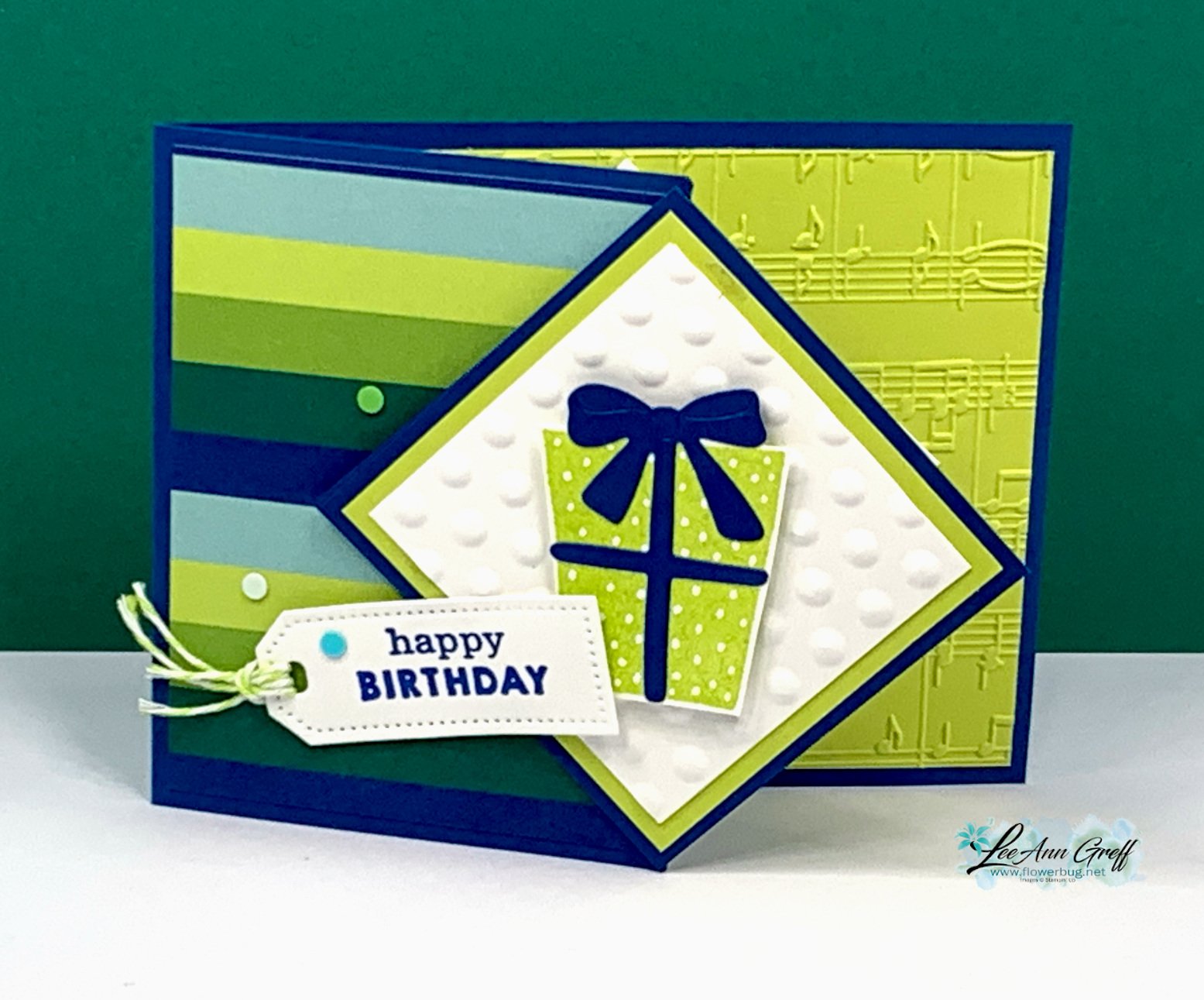 The colors here are Blueberry Bushel, White & Lemon Lime Twist. We fussy cut the gift and added that neat ribbon die-cut over it.