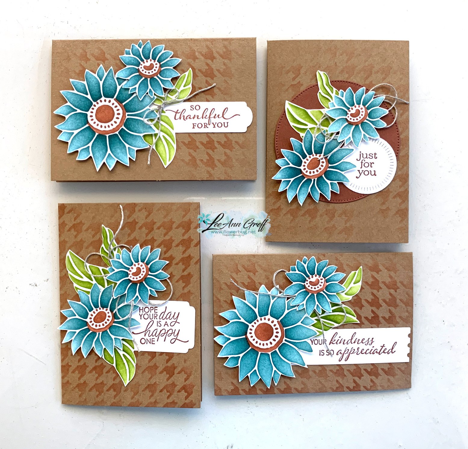 The sunflowers are made with Pretty Peacock ink and the leaves are Granny Apple Green on White cardstock. Yes; they are all fussy cut! I did some but my friend Pat did the rest for me; she loves to fussy cut things!