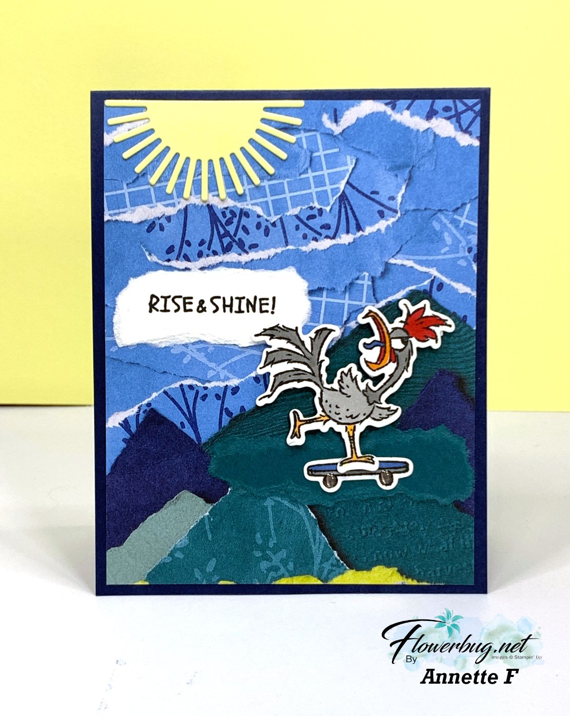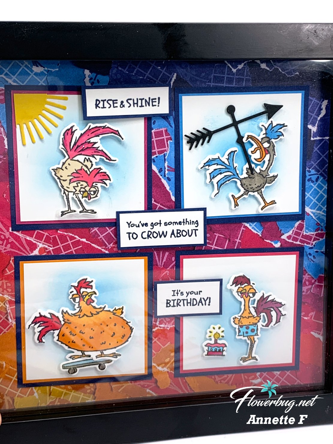 • She used Azure Afternoon ink and blending brushes to add a bit of blue behind her die-cut rooster scenes.