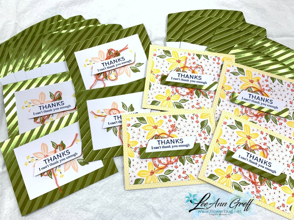 And here are the finished cards!  I did change up the greetings because I needed a bunch of thank you cards.  I kept the kit mostly as is since they were so pretty as designed.