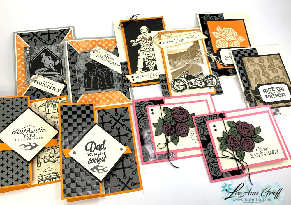 I chose the Ready to Ride specialty designer paper for one of my April card kits to go; it has wonderful black foil designs on one side and fun prints on the other.  It even has a few flowers for the gals; it's not all about men here!