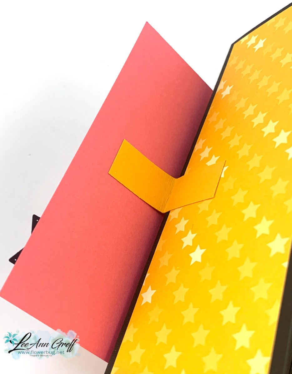 See how the card front is folded in half but the panel is straight?  There's a neat, easy way to do that by adding two little pieces of card stock.  Each strip is folded in half and positioned on both the top panel and the card base.  See the other photo below to understand it.  Or watch the video here.