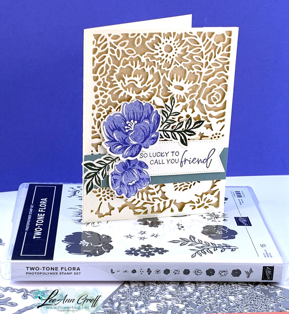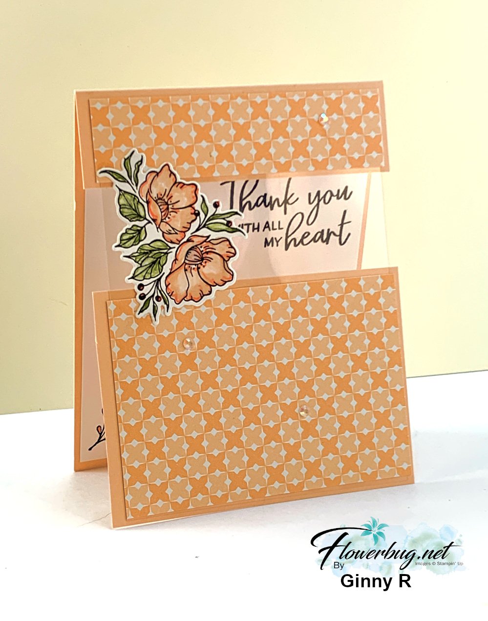 She added a window sheet to bridge the upper and lower layers of the card front. You can see the greeting through the window sheet. Her greeting and the pretty floral die-cut is from the Framed Florets bundle.