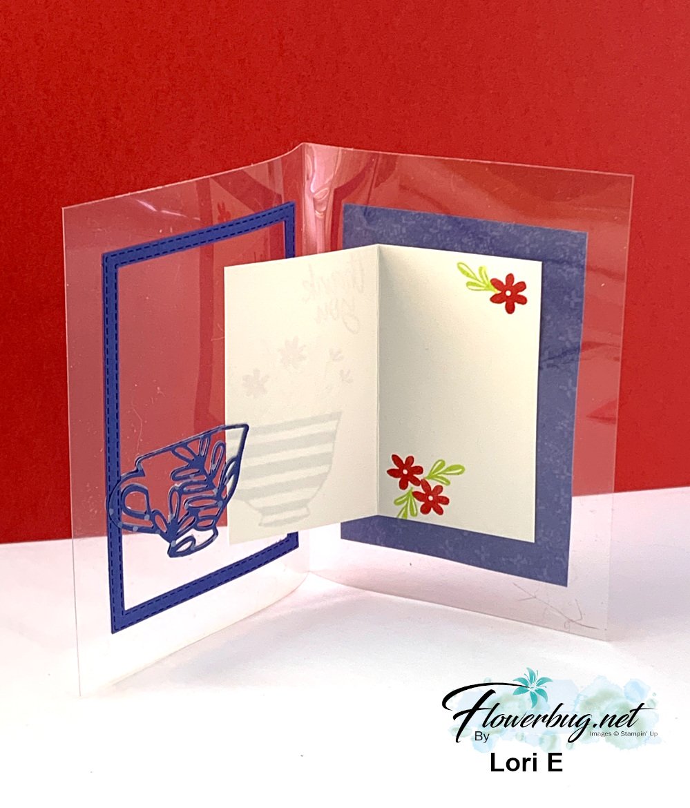 She used the Stitched Rectangle dies for her front 'frame'. It measures 3" X 4 3/8" at the largest. She made two frames; one for the front and one for the inside. The die-cut tea cup is also positioned on the front and the back of the front.