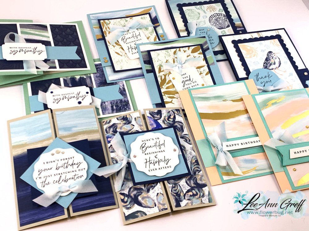 It was my top choice for a January card kit; it's incredibly pretty and not just for beachy themes.  Below you'll see the 10 cards featured in my By the Bay card kit to go.