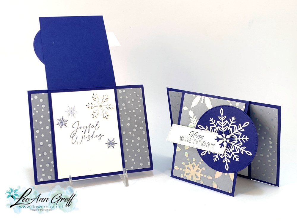 • I used the Joyful Flurry stamp set (retiring) & dies for the inside of the left card.  The Frosted Flurry dies are now out of stock. The birthday greeting on the right is from the Celebrating You stamp set (annual catalog)