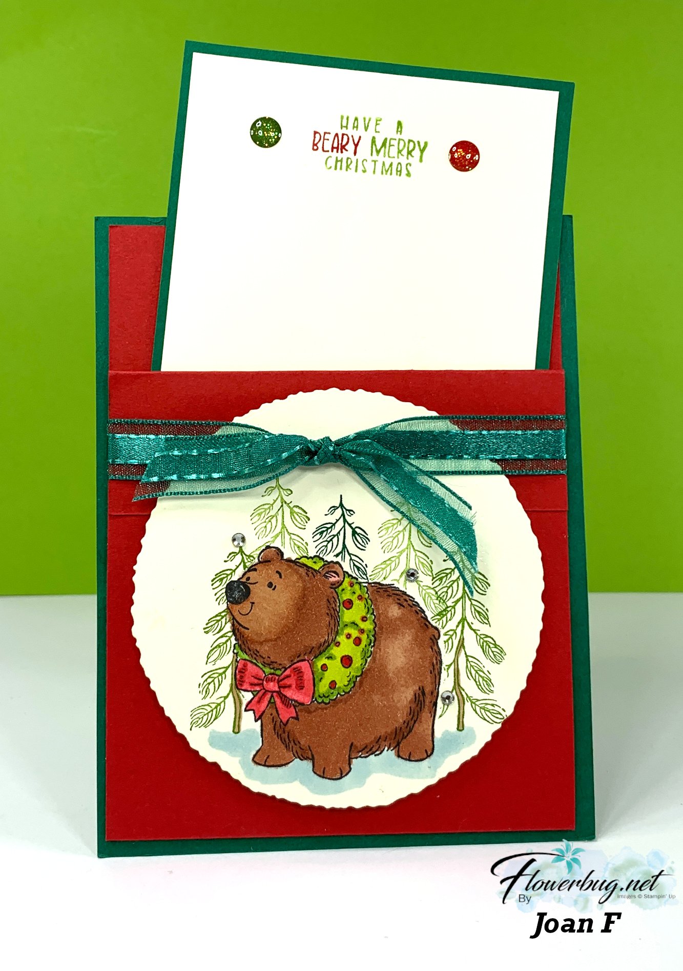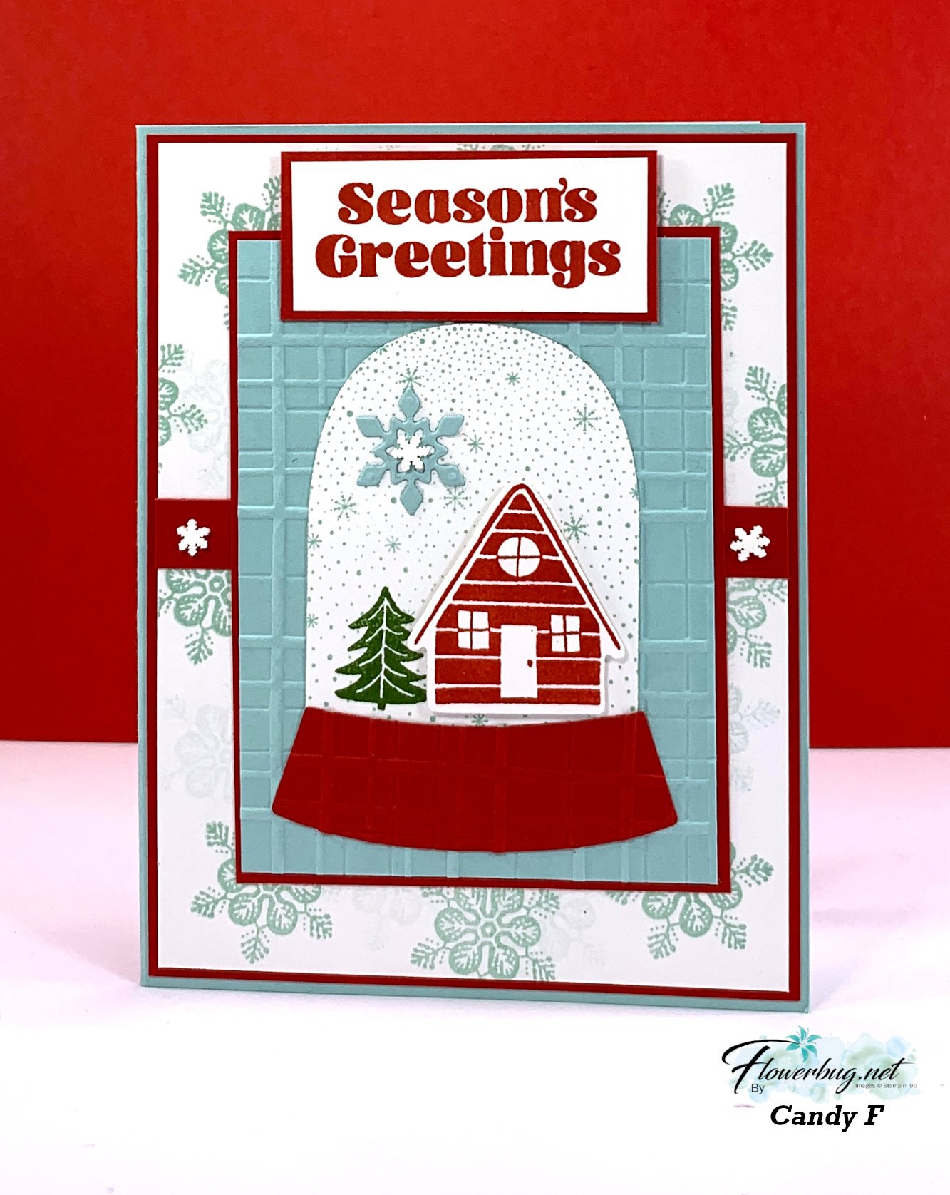 I adore her color combination of Pool Party with Real Red & White. It's one of my favorites for the holidays. She stamped her snowflake background. The snow globe is stamped with the Falling Snow background stamp.