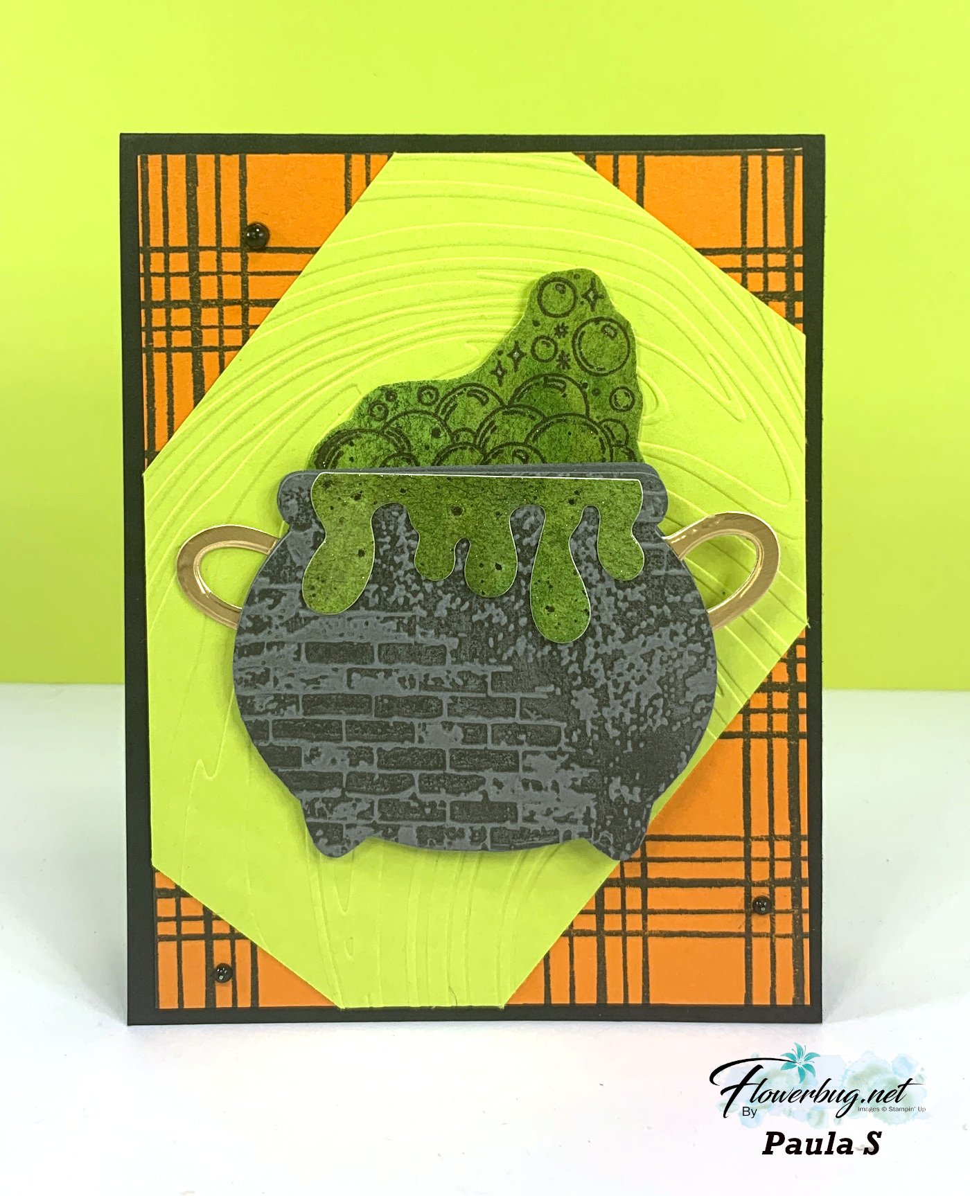 Notice the neat texture of the cauldron. She inked the embossing folder before texturing it.