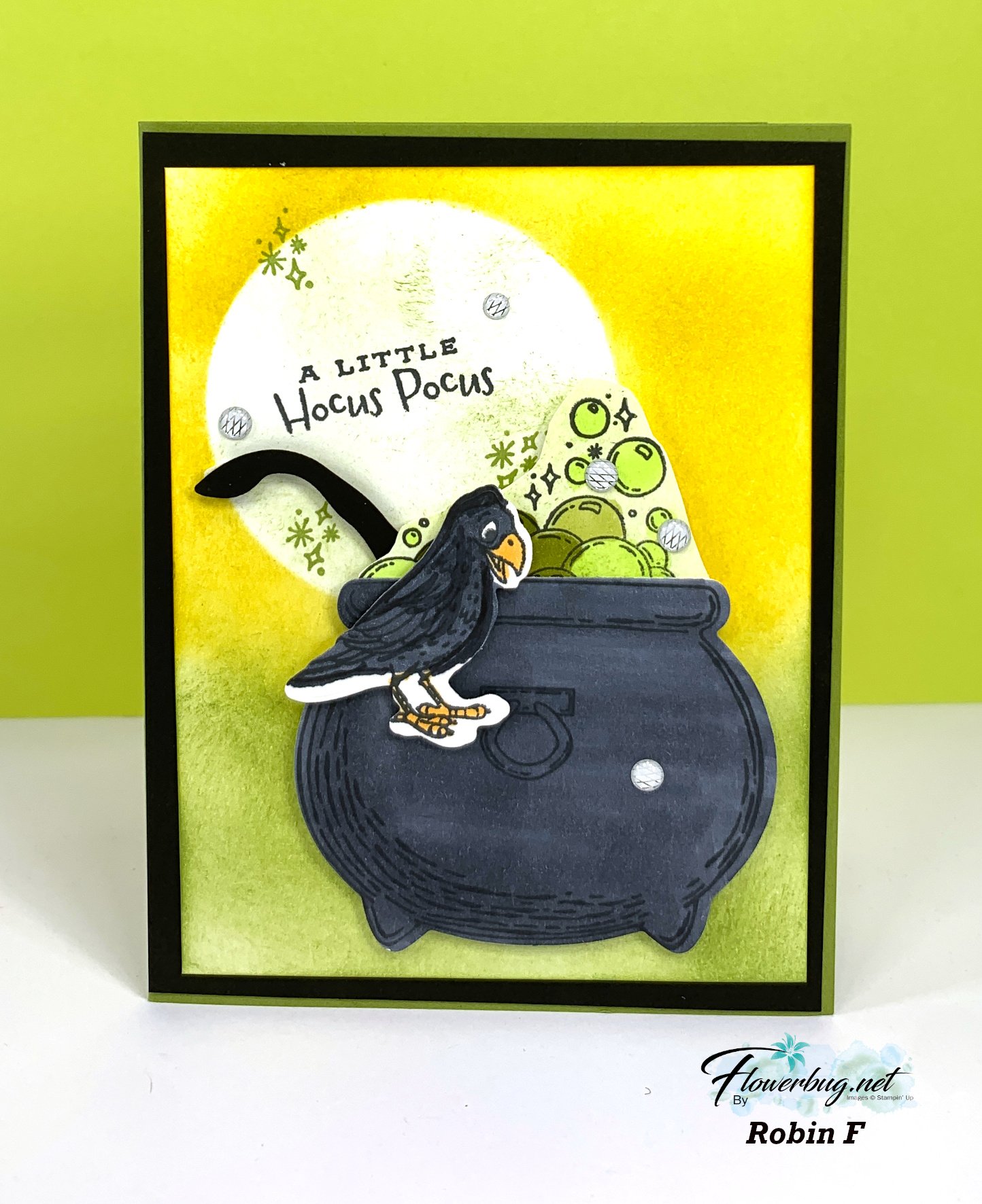 Don't you love her sponged background? She placed a post-it circle onto her White CS before sponging, creating the moon, which is a great place to add the sentiment. It shows off the die-cut cauldron wonderfully.