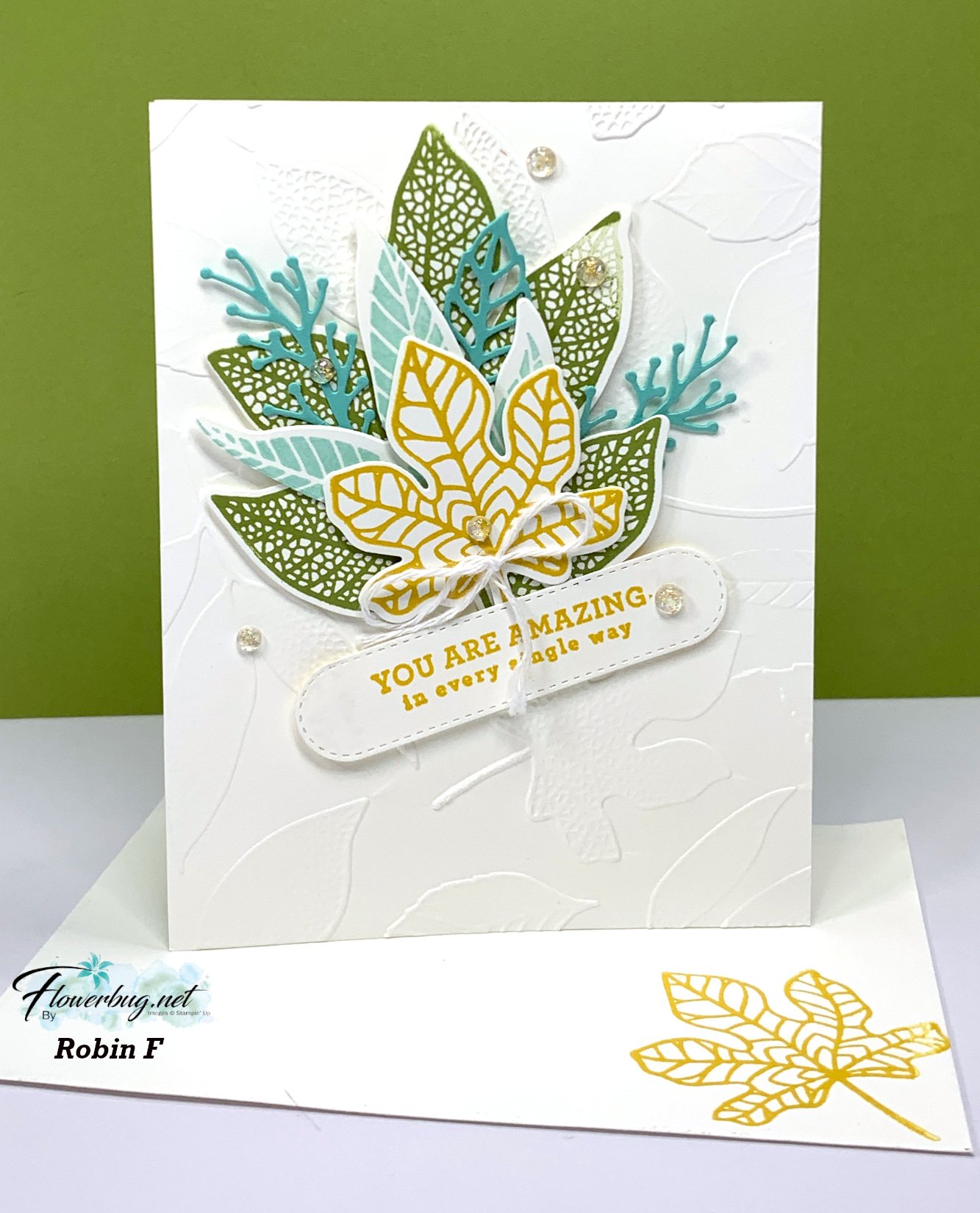 Her colors include Old Olive, Coastal Cabana and Wild Wheat. I love the pretty textured White background so much; it really shows off the leaves & die-cuts.