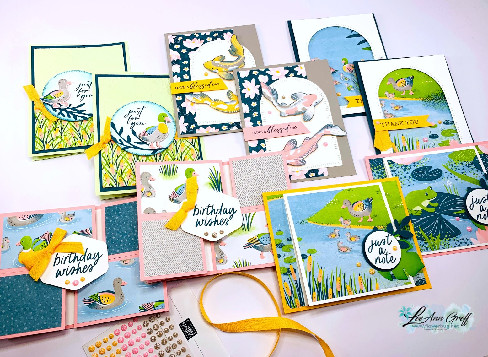 The adorable Lily Pond Lane designer paper is the star of these colorful cards. I created 5 card designs; 3 of which are fun folds. What I like about this DSP is how versatile it is; young or old, men, women or kids – it's great for anyone!